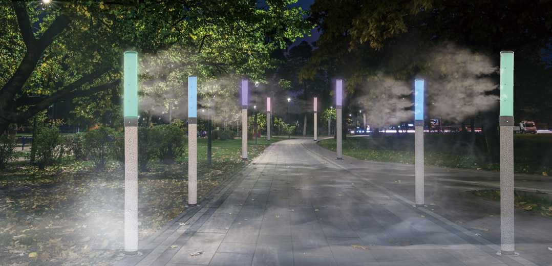 자체 제작 제품으로 긴 원통형에 RGB LED 조명이 탑재되어 다양한 컬러의 표현이 가능하며 하단부의 고급 대리석의 느낌 연출 4면 미스트 분사 형태로 광장이나 공원, 아파트 단지 내 설치 가능